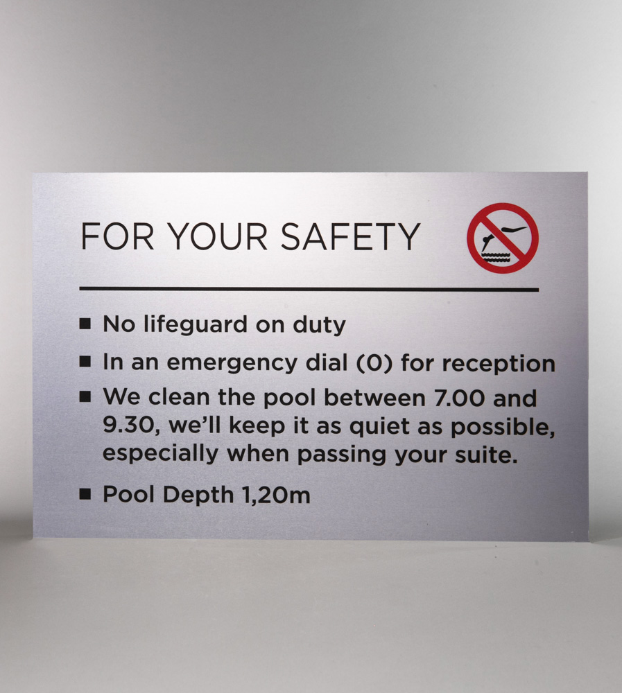 Πινακίδα από ανοδιωμένο Αλουμίνιο πάχους 1mm με απευθείας εκτυπώση uv. Στήριξη σε οποιαδήποτε λεία επιφάνεια με ισχυρή ταινία διπλής όψης. Κατάλληλο για εξωτερική και εσωτερική χρήση.